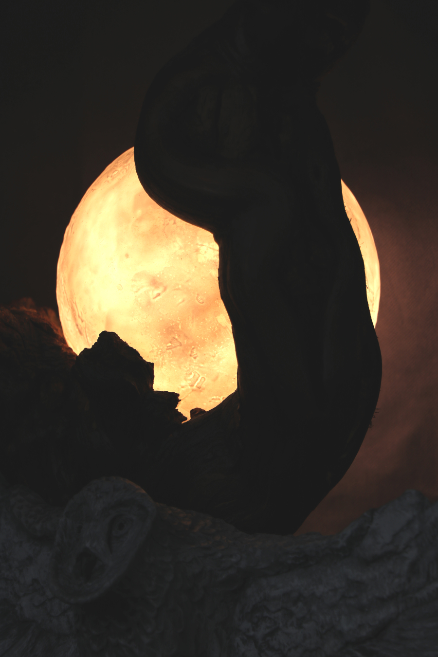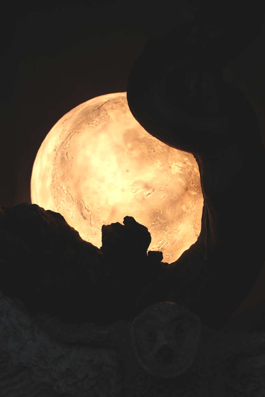 Pied de vigne accompagné d'une chouette en résine peinte et d'une lune illuminée par une ampoule LED E27