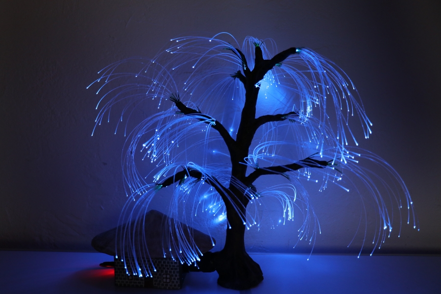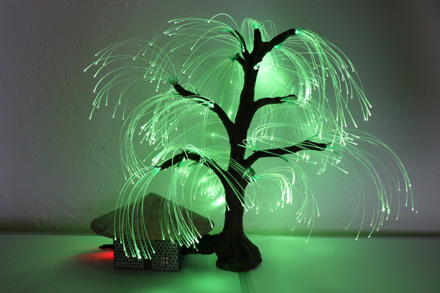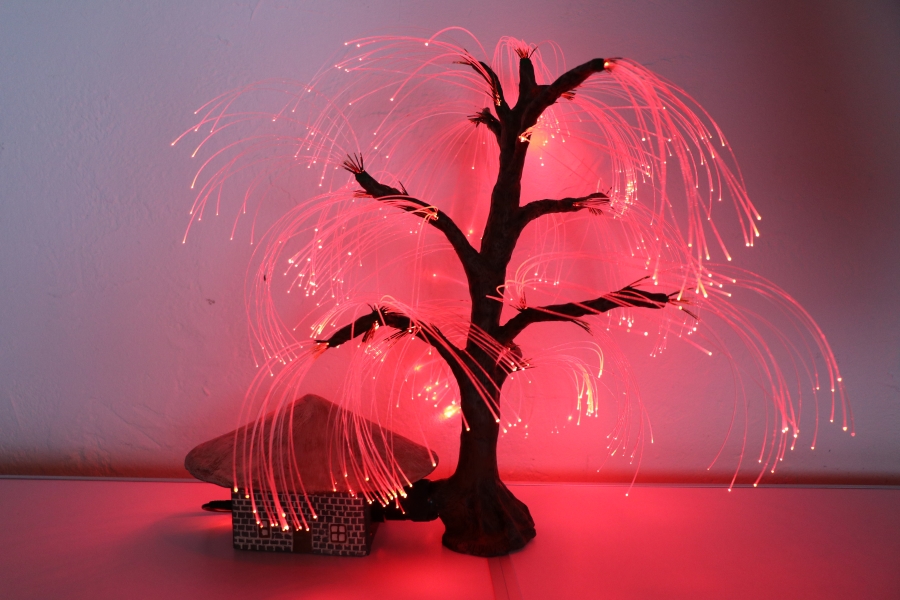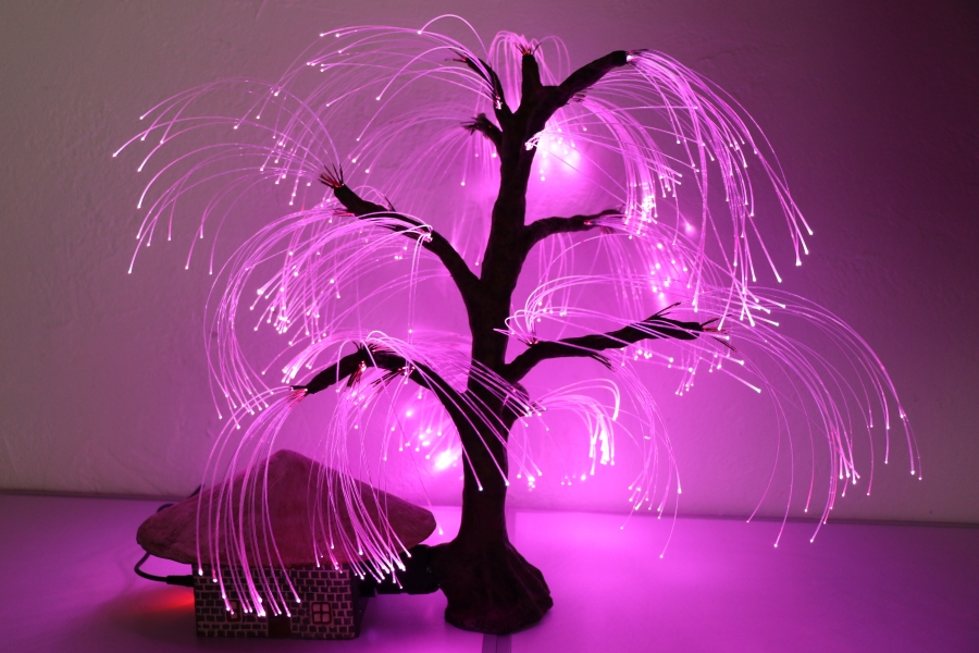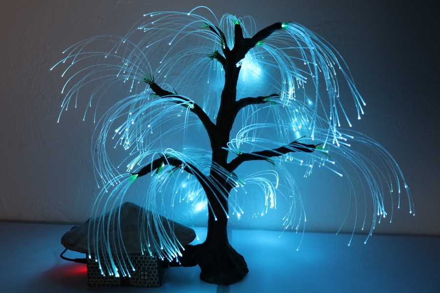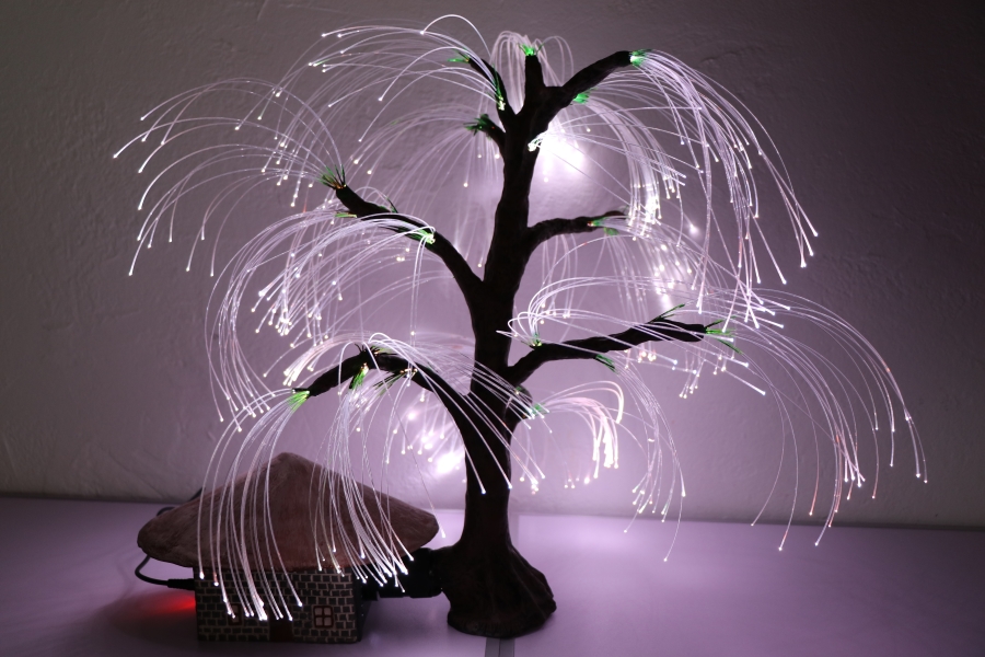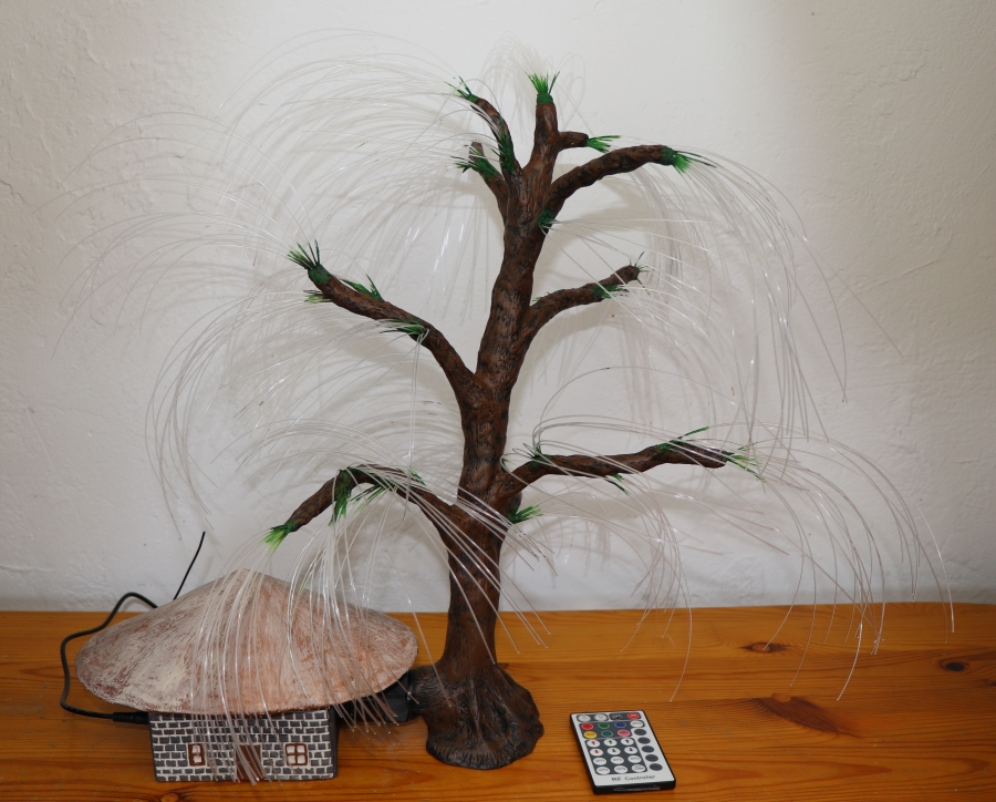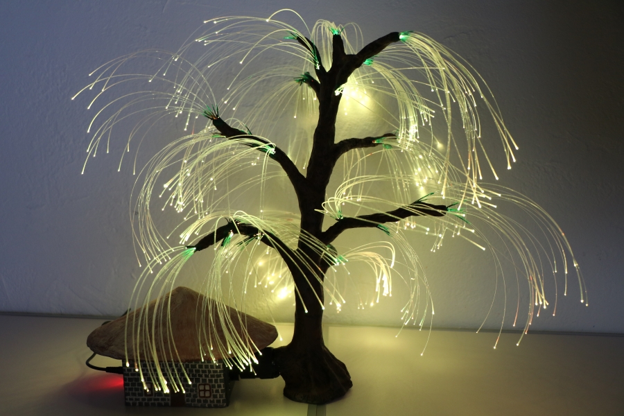 Cette Sculpture lumineuse en Argile est originale et unique, aux allures d'un saule pleureur au coté d'une petite maison. Le tout est illuminé à l'aide de fibres optiques télécommandées, avec différentes options