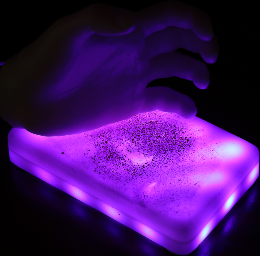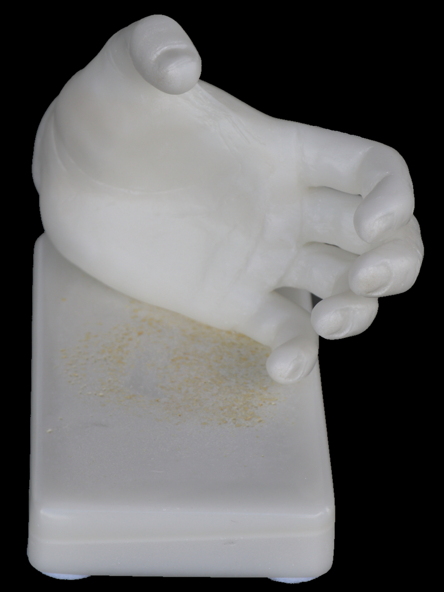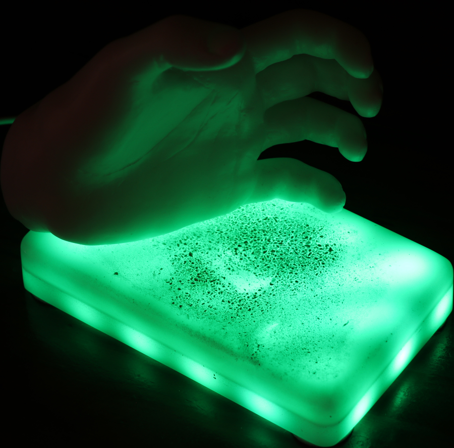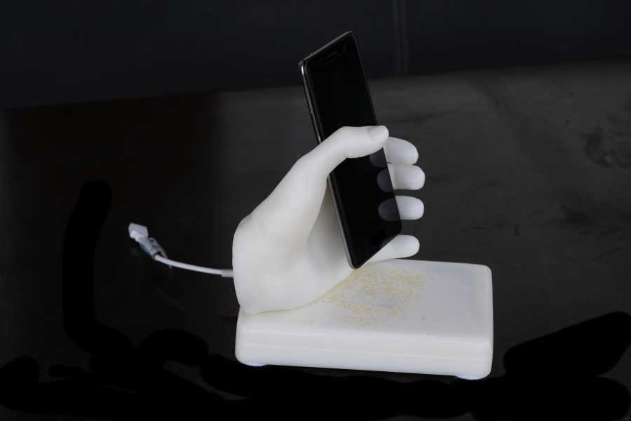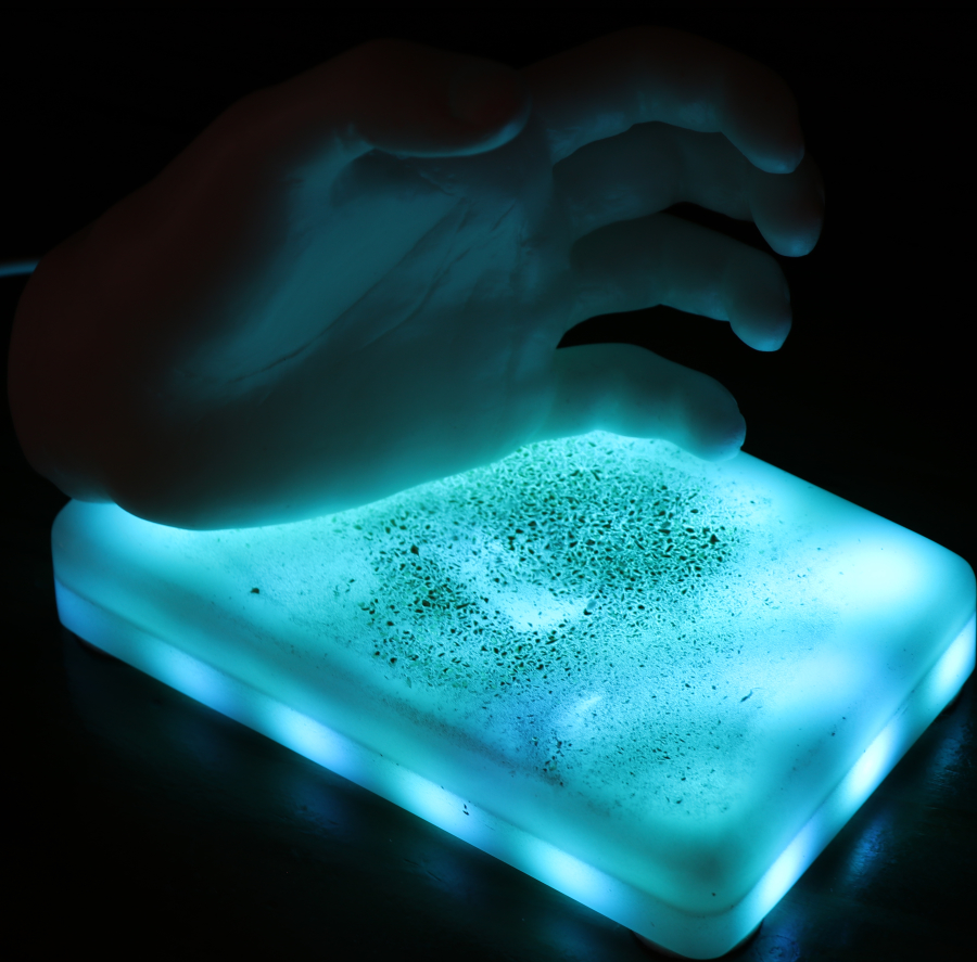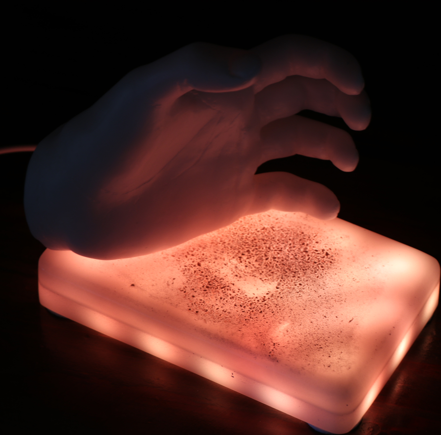Cette Sculpture lumineuse en Résine est originale et unique, un support de téléphone portable en forme de main. Le tout est illuminé à l'aide d'un ruban de LED télécommandé, avec différentes options