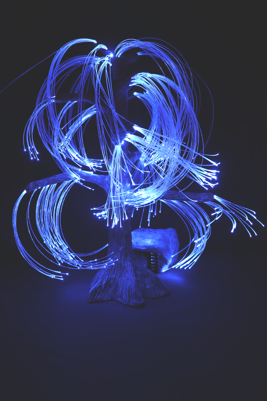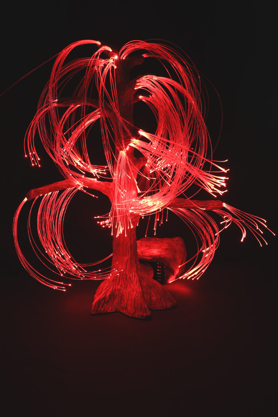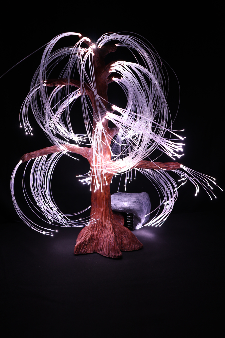 Cette Sculpture lumineuse en Argile est originale et unique, aux allures d'un saule pleureur au coté d'un rocher. Le tout est illuminé à l'aide de fibres optiques télécommandées, avec différentes options