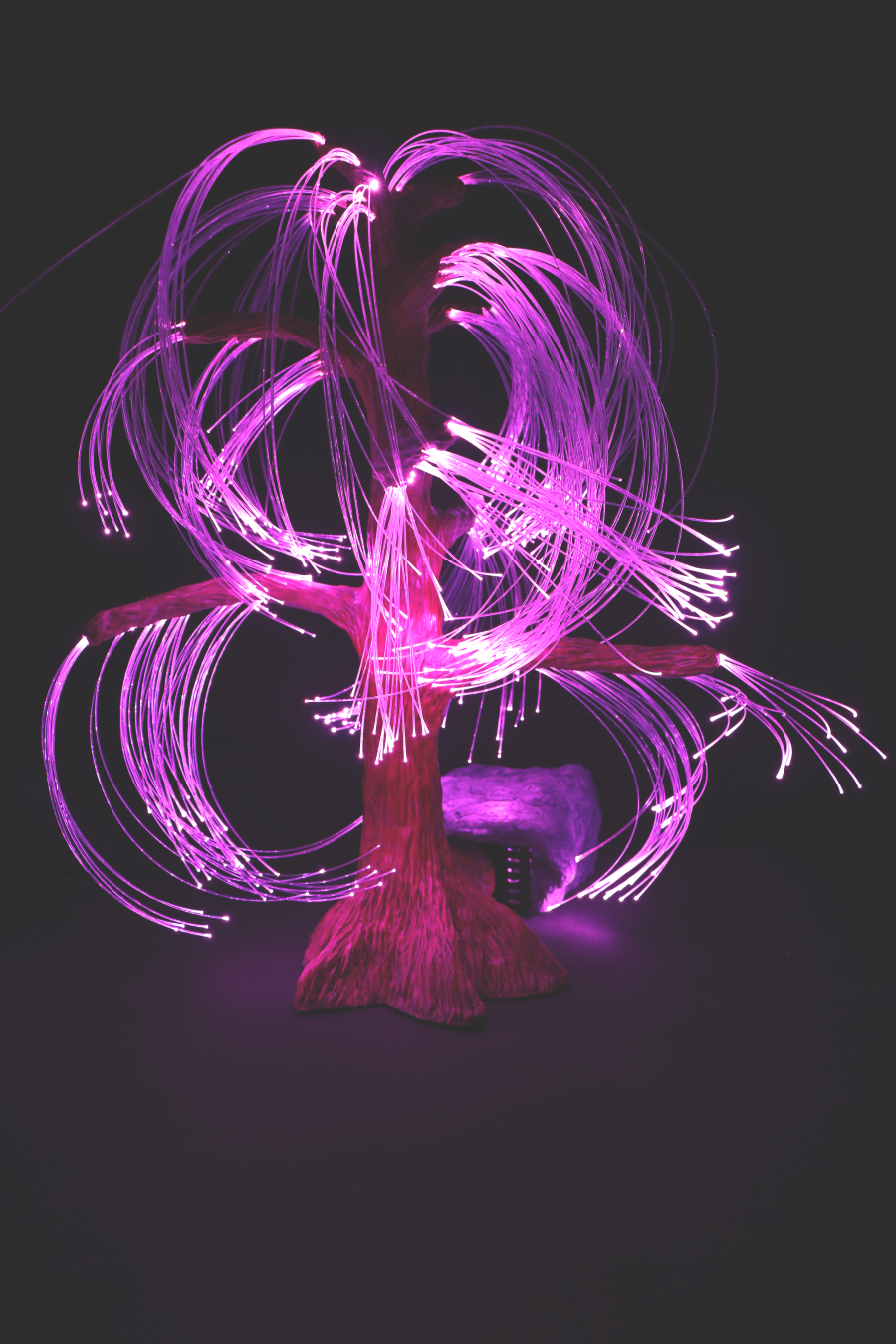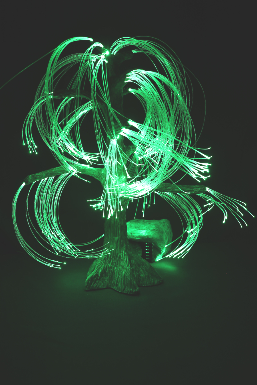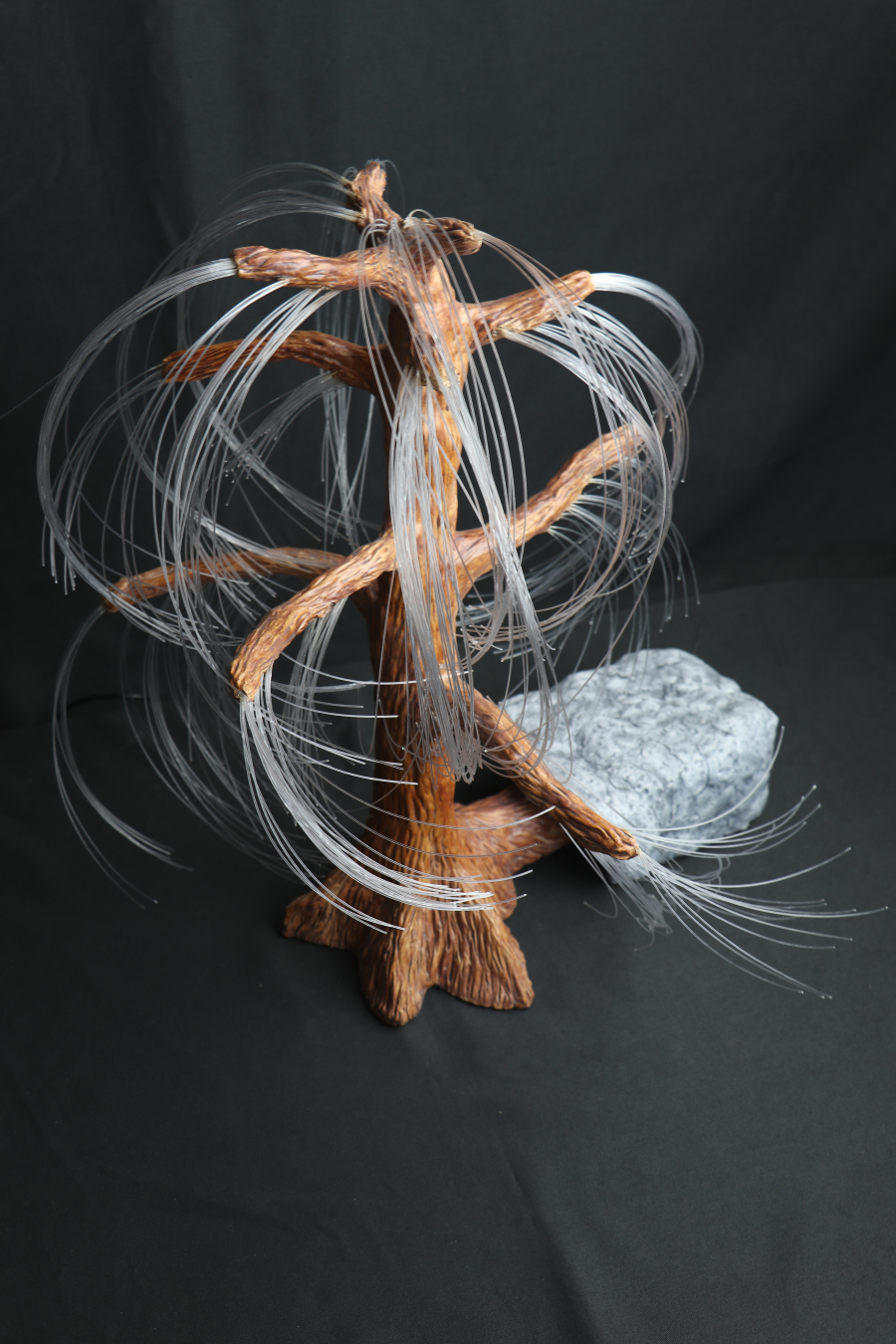 Cette Sculpture lumineuse en Argile est originale et unique, aux allures d'un saule pleureur au coté d'un rocher. Le tout est illuminé à l'aide de fibres optiques télécommandées, avec différentes options