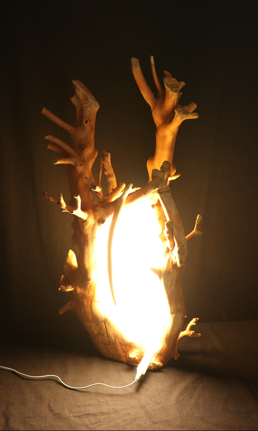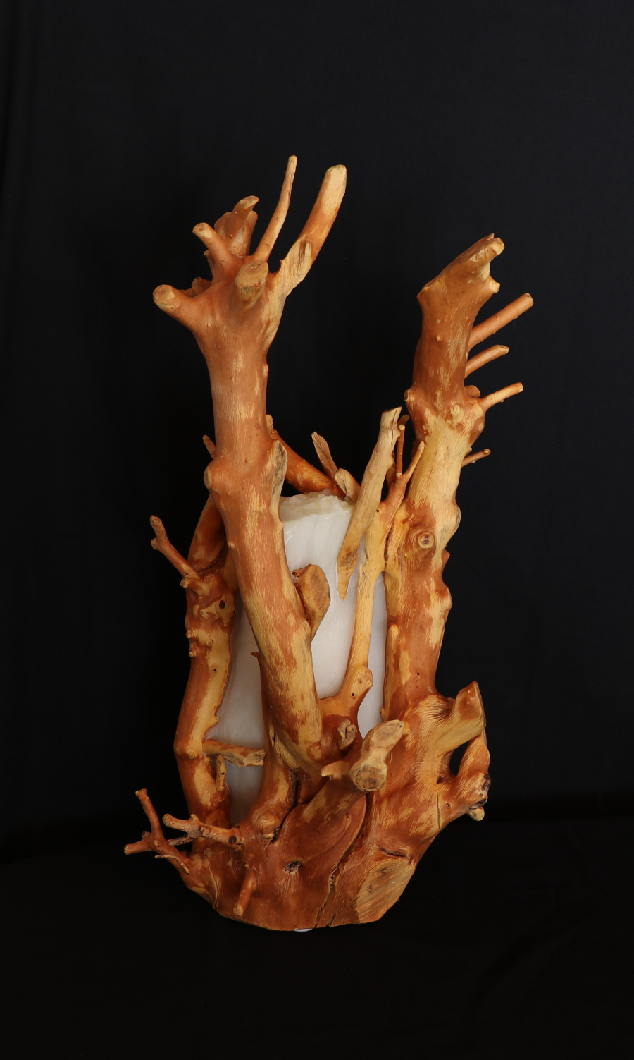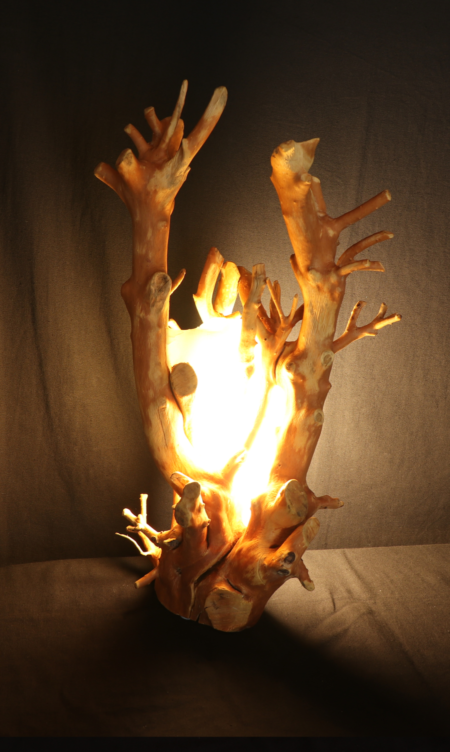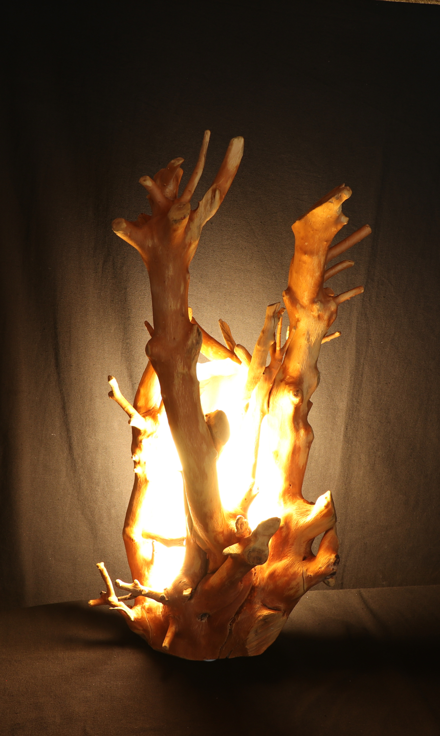 Racine de buis avec en son centre de la résine illuminée par une ampoule LED E14