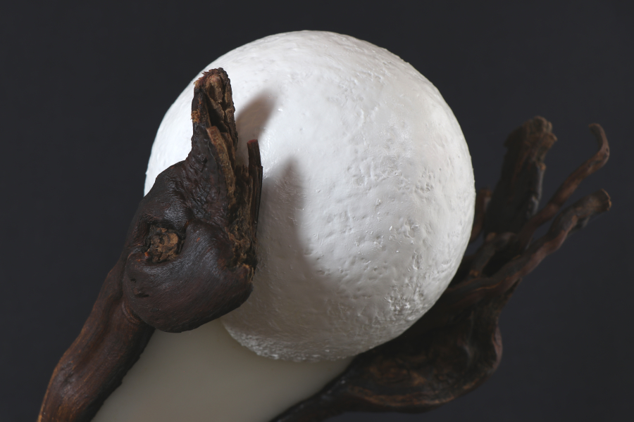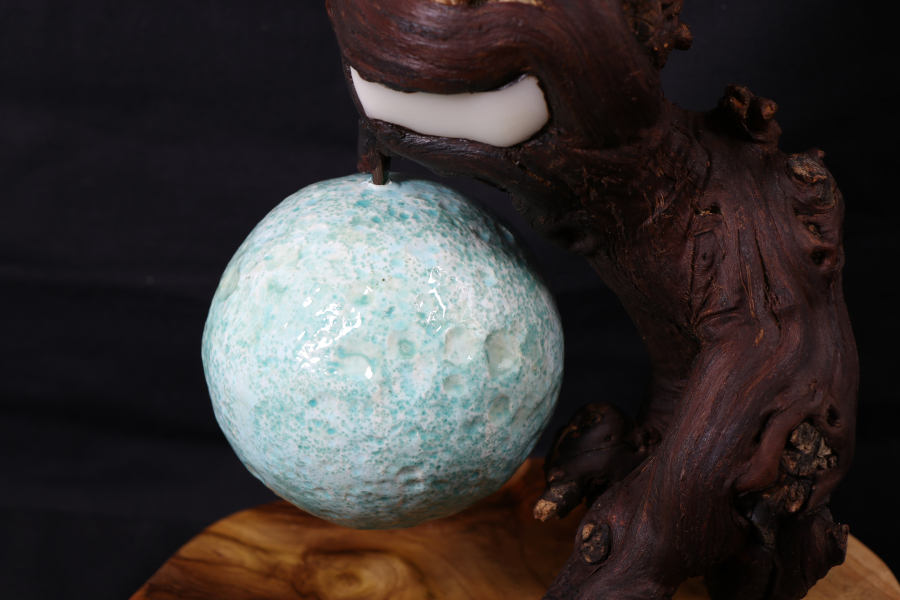 Pied de vigne fendu accompagné d'une planète et d'un soleil, et résine illuminée par un bandeau de LED commandé par télécommande: